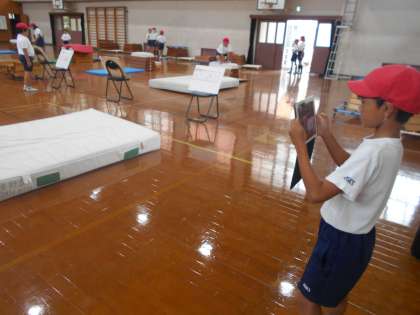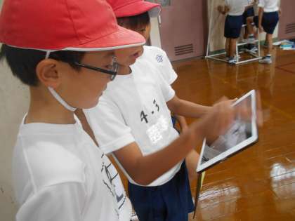 タブレットを使って友達と技を撮り合って,うまくできているか確かめたり,直すところを考えたりしていました。