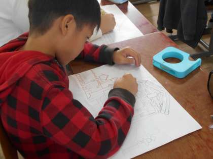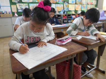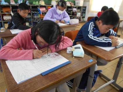 4年生は初めての木版画に取り組んでいます。今日はカーボン紙を使って下絵を木の板に写しました。時々紙をめくって「写ってる!」と確認しながら集中して進めていきました。