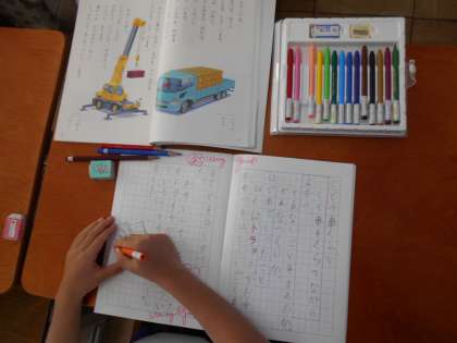 今日は「じどう車くらべ」を読んで初めて知ったことを発表したり,ノートに書いたりしました。