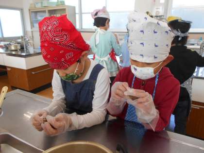 今日はまちにまったおいもパーティーの日です。朝から家庭科室で,高校生のお兄さん,お姉さんのために,「ちゃきんしぼり」を作ります。