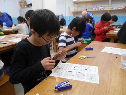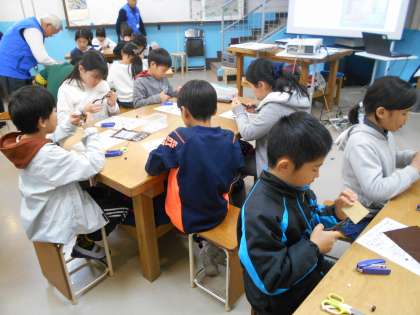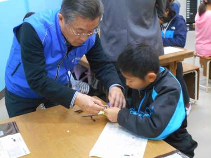 モノレンジャーの方に教えていただきながら,工房学習に取り組みました。みんな真剣な表情で作っています。