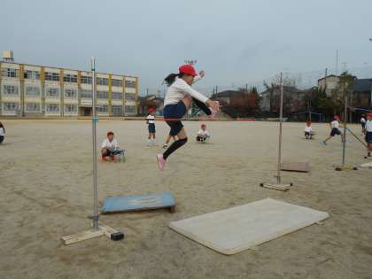 助走のリズムやふみ切る,足のふり上げなど自分の気をつけたいポイントを意識しながら記録に挑戦しています。目指せ自己ベスト!