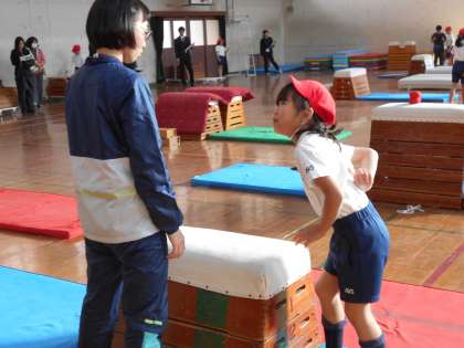 研究発表会で4年2組がとび箱の授業を見てもらいました。他の学校からたくさんの先生方が見に来られたので,少し緊張している人もいましたが,頑張って学習していました。