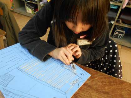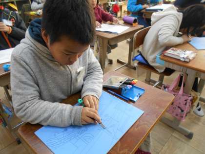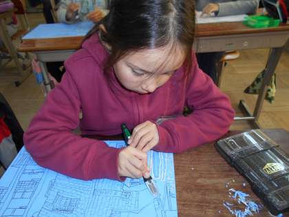 安全に気をつけて彫刻刀を使っています。