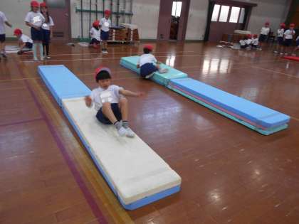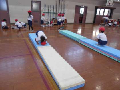 いろいろな場で,自分のできる回り方を繰り返し練習しています。何度も何度も回ると,目がまわりますね。