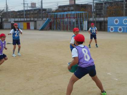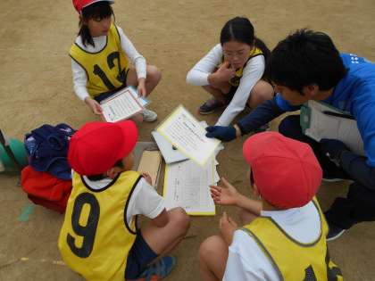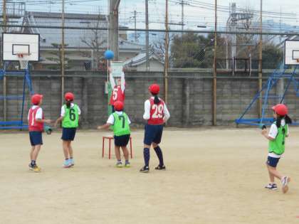 体育でポートボールをしています。パスをゴールまでつないで,シュート!ポート台の上に立ったゴールマンがキャッチしたら得点です。チームの時間には勝つための作戦を話し合います。