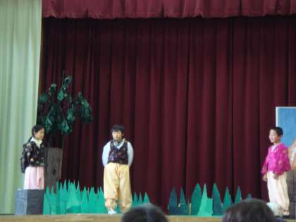 11月18日に学習発表会をしました。韓国朝鮮の民話「お父さんがのこしたもの」を演じました。一人ひとりが練習の成果を発揮し、見ている人たちの心にのこる劇となりました。4月から取り組んできた、リコーダーの演奏もできました。