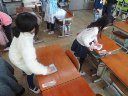 給食時間に,6年生が手作りのプレゼントを持って来てくれました。一針一針心を込めて縫ったぞうきんです。今日のそうじの時間に早速使いました。6年生のみなさん,ありがとう。