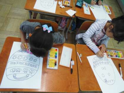 自分だけのひみつのたまごを描きました。楽しいもようですね。中には何が入っているのかな。