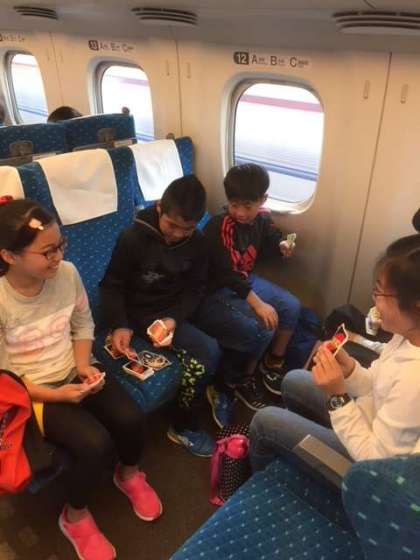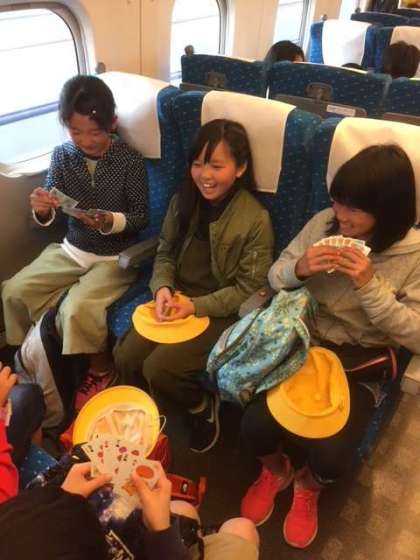 新幹線でグループの時間を楽しんでいます。