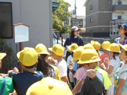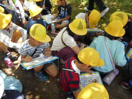 学校の周りの様子を詳しく調べています。方位磁針をもって方角を確かめながら行きました。川岡の町はどんな特徴があるのでしょうか。