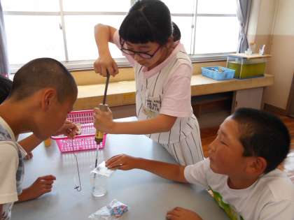 ものが燃える前と燃えた後の気体には違いがあるのかどうか気体検知管を使って調べました。