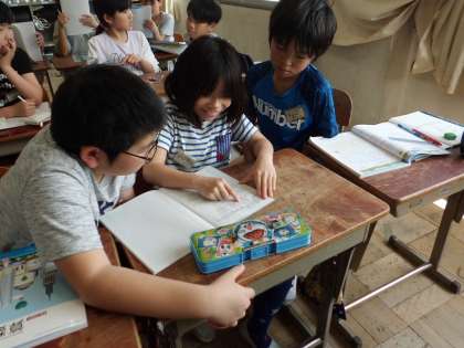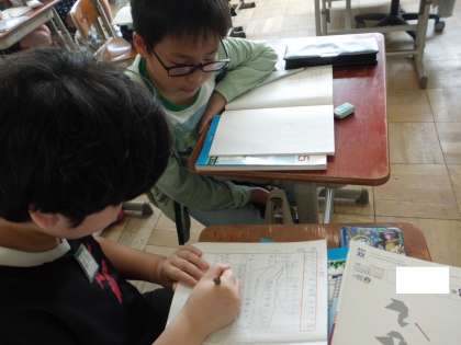 小数のかけ算の筆算の仕方を学習しました。どのように考えれたのか,隣の人に分かりやすく指し示したり,書き加えたりしながら説明しています。