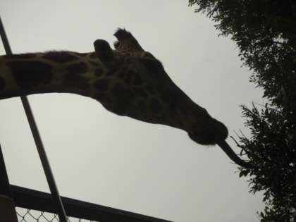 グループの友だちと一緒に,いろいろな動物たちを見ながらスタンプラリーをしました。キリンが首を伸ばして木の葉を食べているところを見つけました。