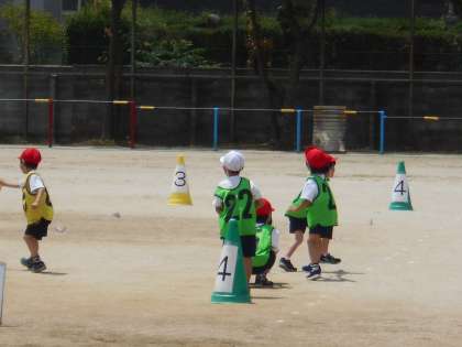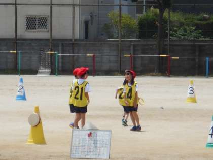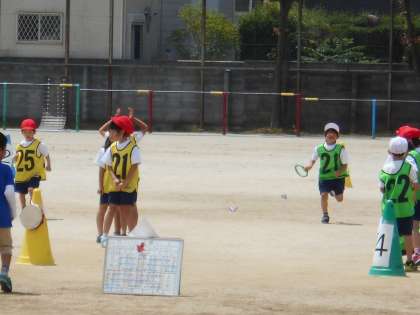 おりかえしリレーです。リングバトンをにぎって力いっぱい走っています。