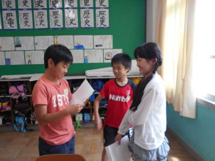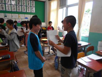 「Can you 〜?」とたずねて自分のプリントを見つけます。