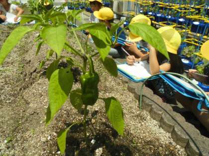 2年生の花壇で,えだまめ,オクラ,ピーマンを育てています。それぞれに,実ができていました。