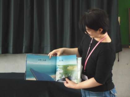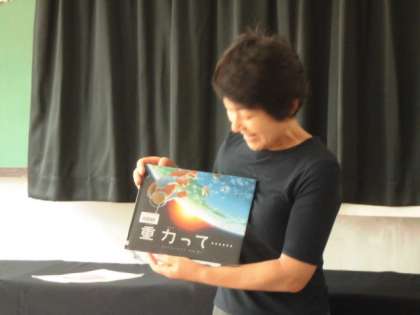 「重力って?」みんな興味津々で聞き入っていました。楽しい紙芝居と絵本の読み聞かせをありがとうございました。