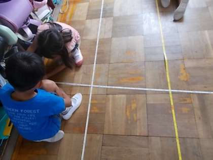 今日は,巻尺を使って,教室のたてと横の長さを測ったり,運動場の木の周りの長さを測ったりしました。