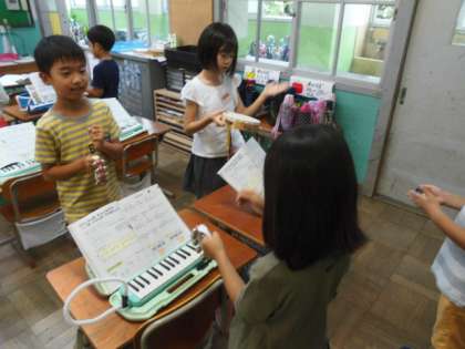 すず,カスタネット,タンブリンなど打楽器と鍵盤ハーモニカを合わせて,「山のポルカ」の演奏を楽しみました。