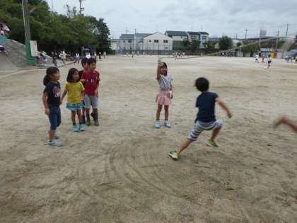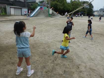 運動場で大繩をして遊んでいました。たくさん遊んで,大繩をとぶのも,回すのも上手になりました。