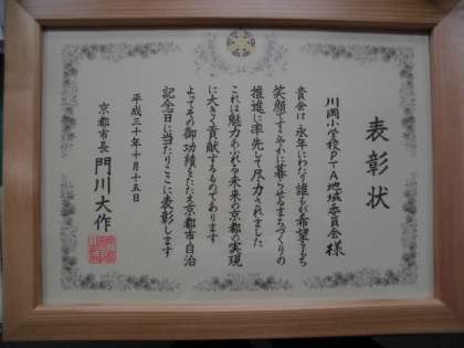 この度,学校安全ボランティアとして京都の子どもの安心・安全の確保に多大な尽力をいただいていることにより,川岡小学校PTA地域委員会が,10月15日に行われた京都市自治記念式典にて表彰されました。いつも子どもたちを見守っていただき,本当にありがとうございます。今後ともどうぞよろしくお願いいたします。