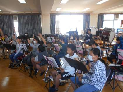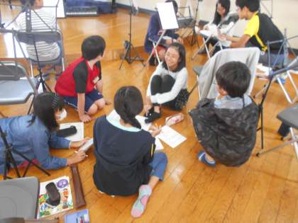 友達と考えながら,曲の感じや作曲者などについて話し合っています。