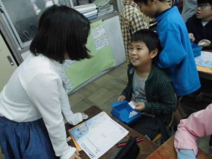 相手が喜ぶような文房具セットを考えて,「Do you have 〜?」とたずねてまわり,必要なものを集めました。