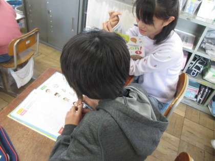 自分の夢の時間割を考えて,「I have Japanese,math,・・・」と友達に伝えました。なぜその教科を選んだのかも伝えました。