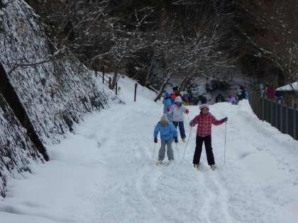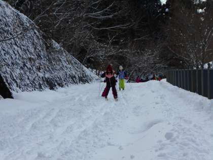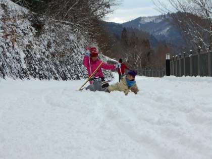斜面に挑戦中。どんどんみんなの滑った跡が雪が固まって滑りやすくなっていきました。