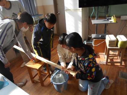 重たい物を軽い力で持ち上げるにはどうすればよいかについて実験を通して学習しました。