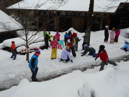 元気いっぱい、みんなで雪合戦をしています。