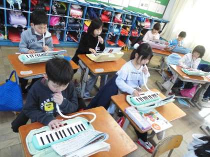 4拍子,3拍子のリズムにのってけんばんハーモニカを演奏しました。