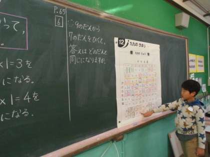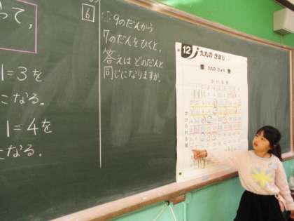 9のだんから 7のだんをひくと,答えはどのだんと同じになるかな。九九の表を使って説明しました。九九の表には,まだ ほかのきまりがありそうなので,もっと調べてみたいですね。