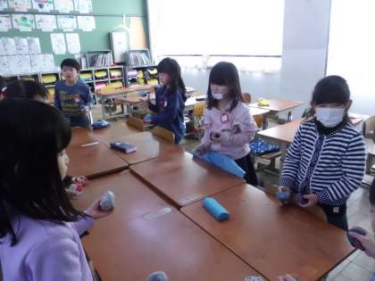 むかしあそびのお礼の会に向けて,お手玉・あやとり・こま・けん玉のグループごとに集まって練習をしています。もっと練習をしてうまくなっておじいちゃん,おばあちゃんたちを驚かせたいです。