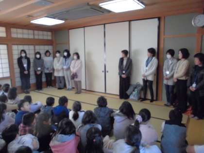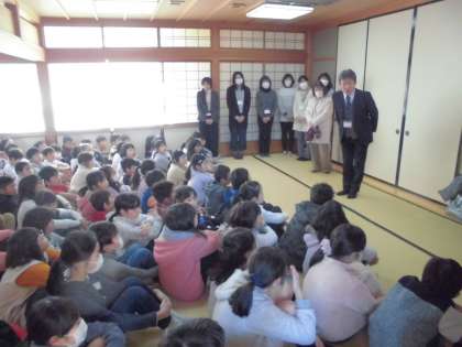 中間休みに和室で放課後まなび教室閉講式が行われました。子ども若者はぐくみ局からは,いつもお世話になっている岩坂先生も来てくださいました。