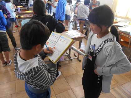 自分の好きな色や食べ物などを尋ねあっています。