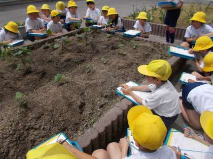 今日は,京野菜の賀茂茄子・万願寺唐辛子・鹿ケ谷かぼちゃの観察をしました。「茎が紫色している。」「葉っぱがハートみたい。」など,興味深く観察していました。子ども達は,大きくなるのを楽しみにしていました。