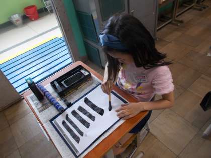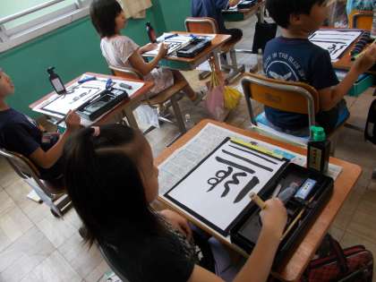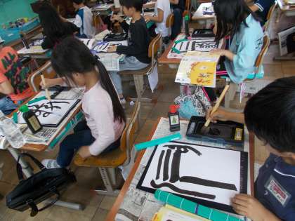 今日は,3年生になって初めて「毛筆の学習」をしました。いろいろな道具の名前をしり,準備や後片付けの仕方も学習しました。また,大筆を使って縦や横の筆の運び方を練習しました。