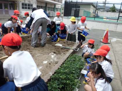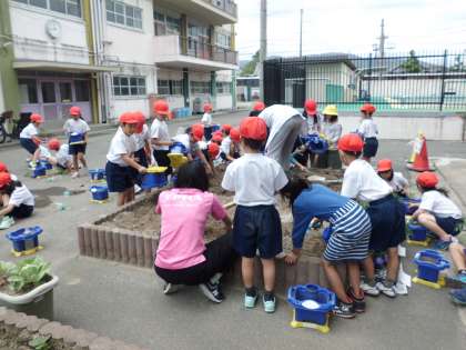 サツマイモの次にミニトマトの苗を植えました。赤くてかわいい実がたくさんなりますように…大切に育てていきましょう。