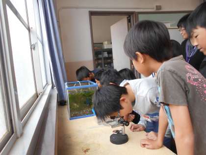 メダカの卵を顕微鏡で観察しています。