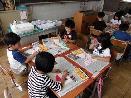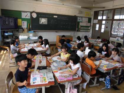 面白い形をした紙を見て想像力を働かせ,思い描いたことを絵に表しました。