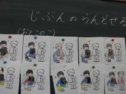 カードに自分のランドセルの色をぬって,クラスで交流しました。