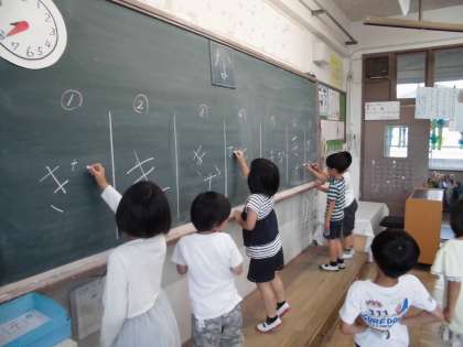 「次は,横棒やで!」「とめるところを気を付けて!」などとアドバイスしながら楽しく活動していました。