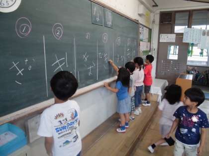 班の一人が1画ずつ担当し,ひらがなを仕上げます。