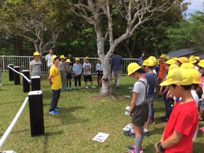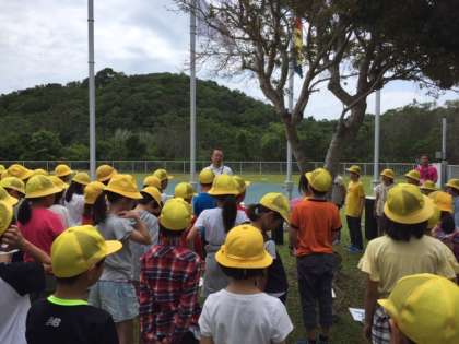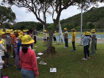 第1営火場で、入所式をしました。リコーダーの前奏に続いて、校歌を歌い校旗をあげました。みさきの家の先生から、お話を聞きました。