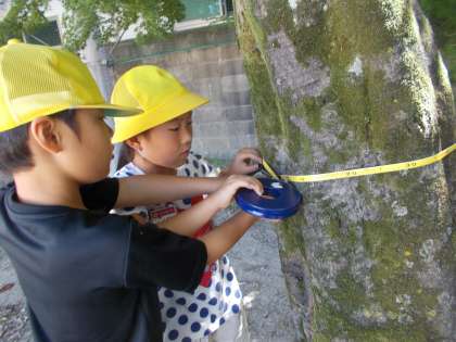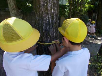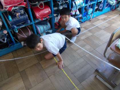今日は,巻尺を使って,教室のたてと横の長さを測ったり,校庭の木の幹の太さを測ったりしました。