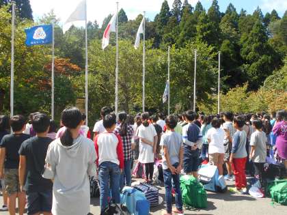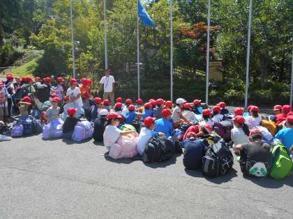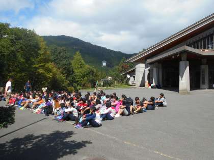 山の家に着きました。学校を出て,1時間45分バスでかかりました。やはり,こちらは少し涼しく感じます。酔う子もなく,みんな元気に入所式をしました。