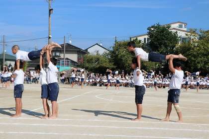 6年生は,組体操「結束〜思いを一つに〜」です。