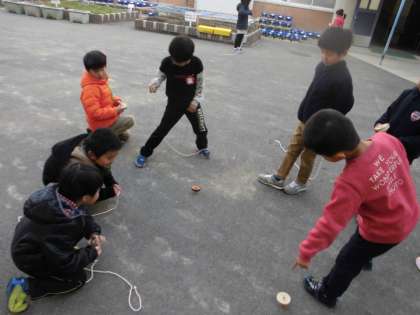 今日は,紙風船つきとこま回しと羽根つきをしました。